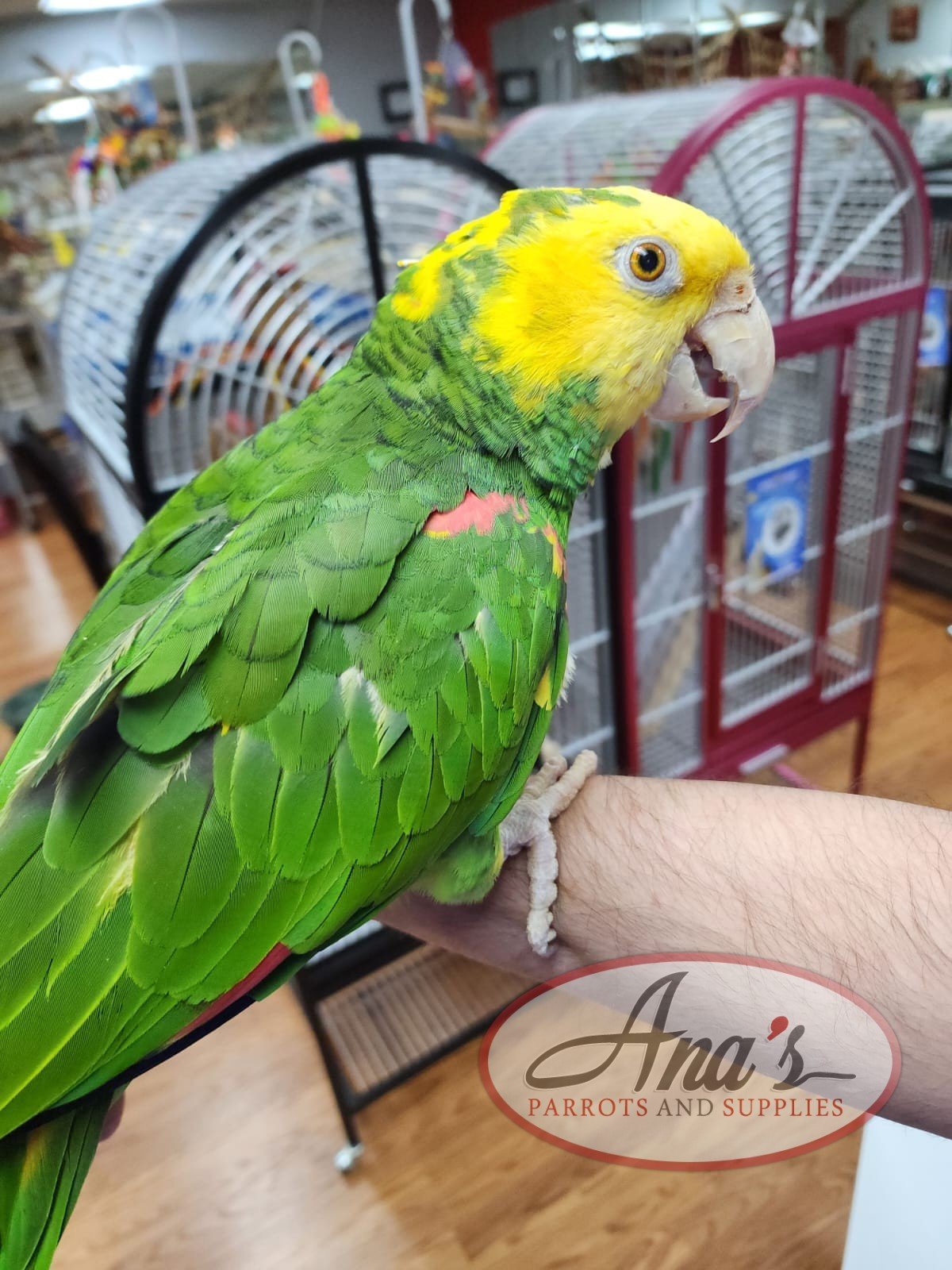 This 3-year old, Double Yellow Amazon is now available. It has deep vibrant colors, excellent feathering, and is above average in its species size. It is not a beginner bird. An Amazon’s temperament must be respected. It has an excellent vocabulary. It also enjoys wooden toys. He/she also has “appropriated” a bell toy from another cage, that it loved to play with.